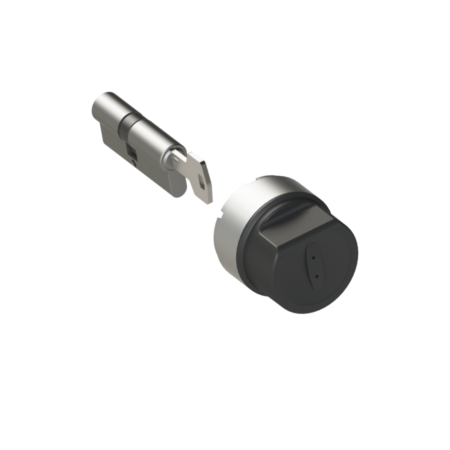 The Utopic RX smart lock mounts onto your existing cylinder. For installation, there must be a minimum gap of 2mm between the cylinder and the door surface. If your cylinder does not protrude beyond the door surface, you can mount it directly onto the door using the special 3M adhesive tape included in the package. For cylinders with a thumbturn, simply remove the thumbturn and attach the plastic adapter provided in the box.